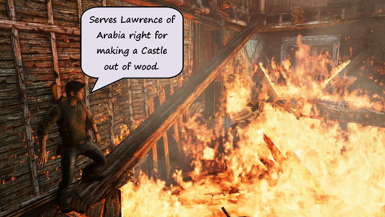 And then there’s the destruction. He kills lots of people, true enough, but as a Teacher and a Historian I find Drake’s rough-shot approach to treasure hunting utterly appalling. When he isn’t desecrating ancient graves or setting fire to historic sites, Nathan wastes little time in reducing forgotten cities to ruin. I am aware that the end of each Uncharted game is merely complying with the age old cliche for ending action stories – the self-destruct style finale – but we can’t ignore the fact that wherever Nate goes, history gets crushed under his boots. It’s not just large scale destruction of History; Nathan shows disdain for the little artefacts too. When exploring the world he discovers a significant amount of small, ancient artefacts, which he builds into a collection throughout each game. Do these hold any interest for Nate? Does the discovery of each treasure excite him? Nope. Each trinket is added to the pile without a second glance. By the start of the next game these items are gone. No explanation given. No final cutscene where Drake admires his collection of historic wonders. These priceless items should have been delivered to a museum. Instead, Drake most likely sold them off to the first person with money or dropped them down a hole somewhere.