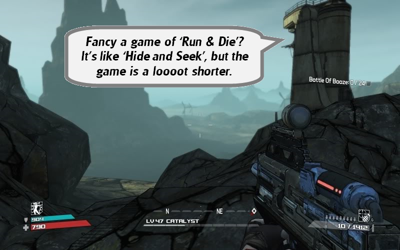 A more recent use of the Murder Wall occurs on the border of Borderlands. Rather than boxing the player in, the game creators decided that the best way to prevent players from leaving the designated shooting areas would be to blast the player’s character out of existence (temporarily of course). Gun towers fixed along the perimeter face their guns outwards in search of any poor fool who believes in the freedom to go where they please. The gun towers seem quite illogical at times (Couldn’t the guns turn round and wipe out these evil bandits now and then? Surely my rocket launcher is superior to an over-blown turret?) but gun towers don’t really care about my opinions.