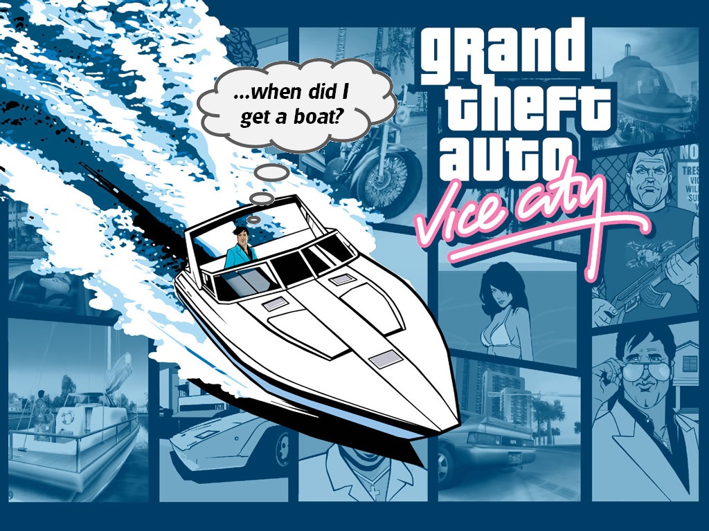 The Grand Theft Auto series has tried several different methods of containing the player within the gaming world. In ye olden days, you weren’t allowed boats and you weren’t able to swim. Easy enough. With a rapidly growing ensemble of boats and aircraft more elaborate methods were needed. In the most current realization, all vehicles cut out once you reach a certain distance from the shore, and the sharks take what’s left of you. It’s like you’re living in an extremely aggressive version of The Truman Show.