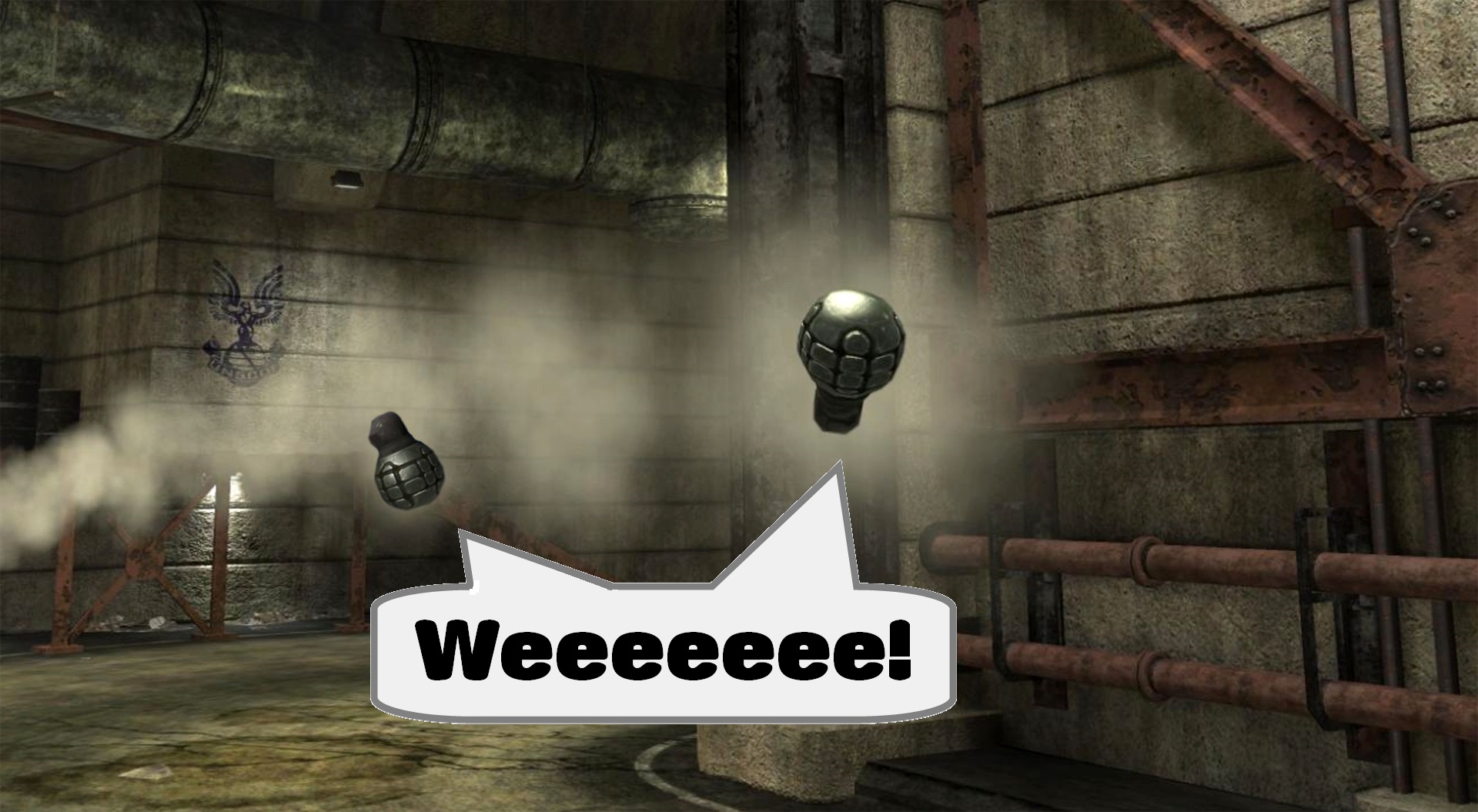 This might seem a little obvious at first. Of course grenades will make you feel weak; they are balls of suppressed explosion ready to spread you across the landscape. But reflect on the role of grenades in action games. They prevent you from spending your hours hiding behind cover as your enemies wander towards you. Your plan of attack can be stalled entirely by that bleeping arrow that indicates that a ball of death is nearby. Grenades are also the perfect way to ensure that person who killed you in multiplayer dies too. They are a game changer.