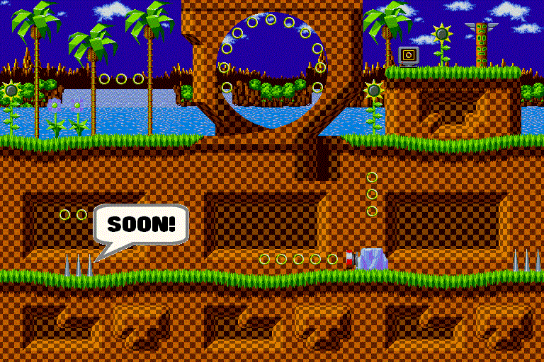 I find it quite difficult to believe that these spikes are natural parts of the landscape, especially in the Green Hill Zone, but I also find it challenging to accept that Eggman left them there. Having seen how devastating spikes are to Sonic’s progress, I can’t imagine why the moustachioed villain doesn’t abandon all robot building efforts to begin mass producing the large metal barbs, coating each world with a layer of murdery goodness. The reason why Eggman doesn’t do this, is that the game wants you to spend most of your time running at speed and bounding across chasms; the game only wishes to occasionally impale the hedgehog, just to point out who’s really in command.