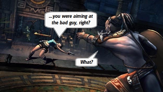I and the friend I was playing with disagree on how the silliness started. We both know that it began when I dropped him, but I state that it was an accident, whilst he believes it was on purpose. He/Totec was dangling over a cliff face, abseiling with the use my/Lara’s grappling hook, reaching out for a hidden treasure, when I accidentally released a button and sent him tumbling to his doom. As with every death, he respawned nearby a moment later. We laughed about it, but we both knew he’d want payback. A short time later I was balancing on a well-placed Mayan spear above a nest of spikes ready to jump to the far side. My companion suddenly loosed three spears in random directions. Why? Because there can only be three spears on-screen at once. When he threw the fourth spear, the first one disappeared. I was quick enough to take flight a split second before my perch sparkled out of existence, but from then on we were wary of each other.
