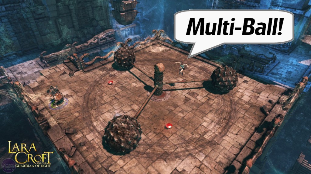 Lara Croft and the Guardian of Light never asks to be taken completely seriously. It has a comic book look to its cutscenes, there are traces of humour in the dialogue and the main villain is accidentally hilarious (he appears at the start of almost every level, boasts about his unstoppable power, then runs off so he can do the same thing at the start of the next level. Mwah-ha-ha, run away, repeat). Nevertheless, the game never implies that the players should be as silly as we were. We were offered the grappling hook, spear, bombs and balls as useful tools to aid us on our quest. Instead we misbehaved, and had a lot of fun tripping each other over.