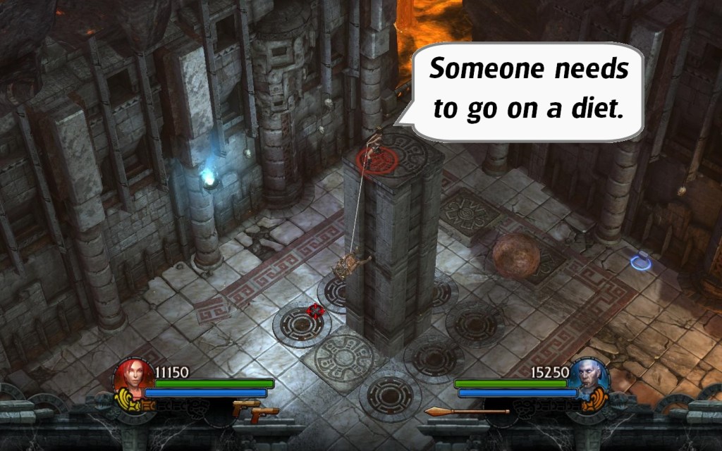 Totec can throw up to three spears into walls to provide balance beams across spike pits; Lara can winch herself up walls or can create a tightrope to nearby ledges. When both characters are holding an end of the grappling hook cable, one character can be lowered down safely. Some bonus rooms require a combination of these skills (and some ingenuity) in order to claim the prize. It’s this focus on teamwork that makes Guardian of Light a really entertaining Local Co-op experience. It’s a shame I had to ruin it.