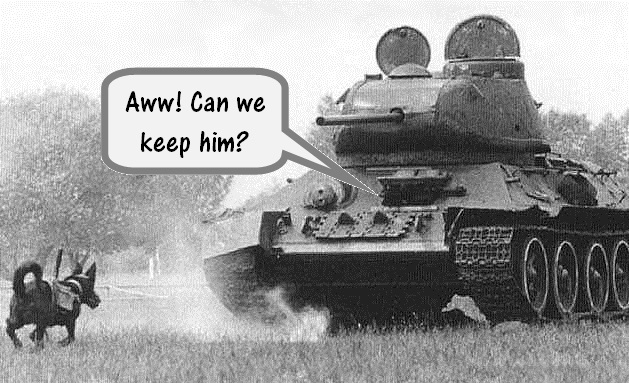You may have already seen this image floating around on the internet. This is a photograph highlighting the attempts made to turn dogs into bombs. Most tank crews would think nothing of a stray mutt wandering up to their machine; by the time they noticed the explosive vest it would be too late. Just like the sheep and ferrets of theWorms series, the detonator is in the hands of the owner. The “dog mines” were an idea invented by the Soviets, and were employed against the Nazis in 1942.