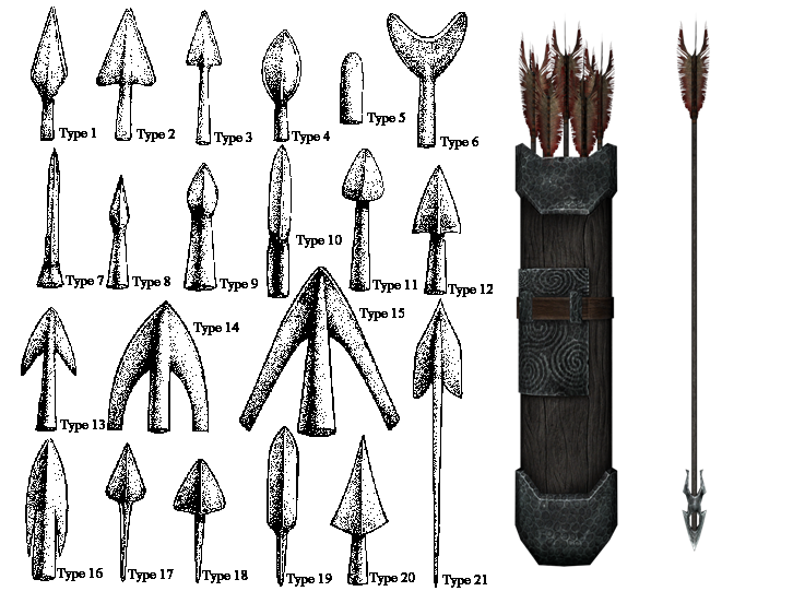 Below are a collection of arrowhead designs. The ‘barbed” arrowheads present the gruesome way that arrows are made to cause maximum pain. The arrow goes in very easily, but will want to stay forever. This actually exploits the way that the skin and muscle with try to naturally close a wound. To make matters worse, arrow heads are usually bound to the arrow shaft in such a way that they will break away if yanked on. A common adhesive was beeswax; the arrow head would stay glued on in flight, but come undone when the injured warrior tries to de-arrow themselves. That might help to explain why not every arrow in Skyrim can be retrieved from the corpse of your recently departed enemies.