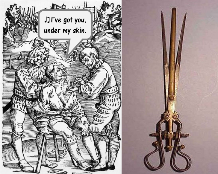 This situation was so common that barber-surgeons actually invented arrow-pulling tools to make the job easier. They did not make the job less excruciating or graphic. Most of these tools involved pushing/pulling the surrounding flesh further away from the missile, making it easier to retrieve the offending item by hand. You would want a Potion of Cure Disease handy, because the process is undoubtedly going to lead to infection alongside the brain-punching pain. The surgeon at hand may have an anesthetic (white wine was popular in Europe) and maybe a mild sedative (opiates if they’ve got them), but there’s no denying this process is incredibly dangerous. And if it goes wrong, the barber surgeon may return with another tool: a dirty, big saw.