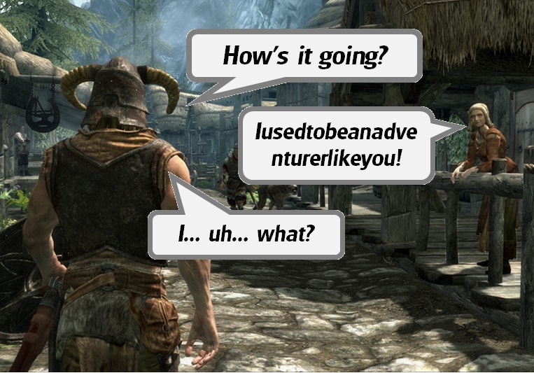 I was surprised by how few NPCs have actually expressed the immortal phrase, “I used to be an adventurer like you, but then I took an arrow in the knee” during my journey. Oh sure, at least four different people have shared that particular woe with me, but the sheer magnitude of references to this phrase on the internet had led me to believe that this line of dialogue punctuated every sentence. I half expected to discover that this was actually a form of greeting among townsfolk.