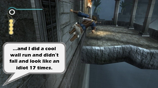 It’s a shame that the 2008 version of Prince of Persia did away with this notion. In that game, your magic sidekick Elika would intervene at the moment of your death. You could never fall to your doom because the floaty lady could throw you back to solid ground. This was another clever way of coping with the player’s clumsiness, but Prince’s tendency to misremember his own story added to his charm.