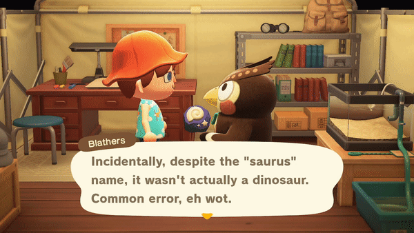 From the very first time I shook a tree for loose branches, or pole vaunted across a river, she’s found the game as joyful as we do. She especially enjoys watching us fish, and is a big fan of Blathers, the anthropomorphic owl and museum curator. She will call “ready, steady go!” when she wants us to sprint around the island, and wishes all the residents a good “mornin'” as we do the rounds.