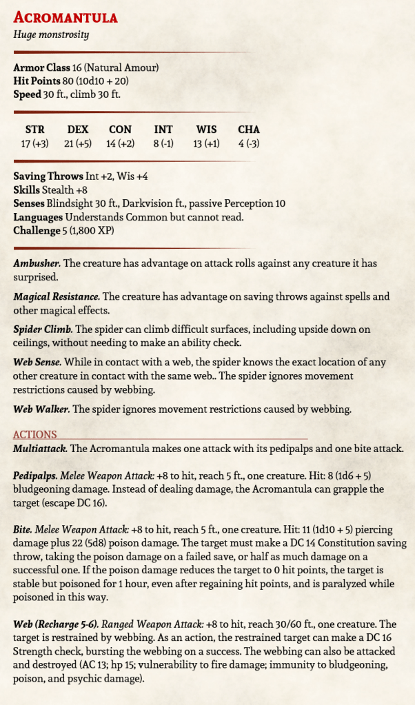 I added some mental saving throws, and Magical Resistance, to match the stated difficulty in taming these monsters, and the Ambusher ability to make the sneaky Acromantula’s first strike all the more potent. Yet the most entertaining aspect, was boosting the spiders intelligence and adding a spoken language. These creatures are surprisingly intelligent, and can speak, luring their unsuspecting prey with human-like cries. Never mind that poisonous spike, being goaded by a huge spider definitely makes for a great encounter.