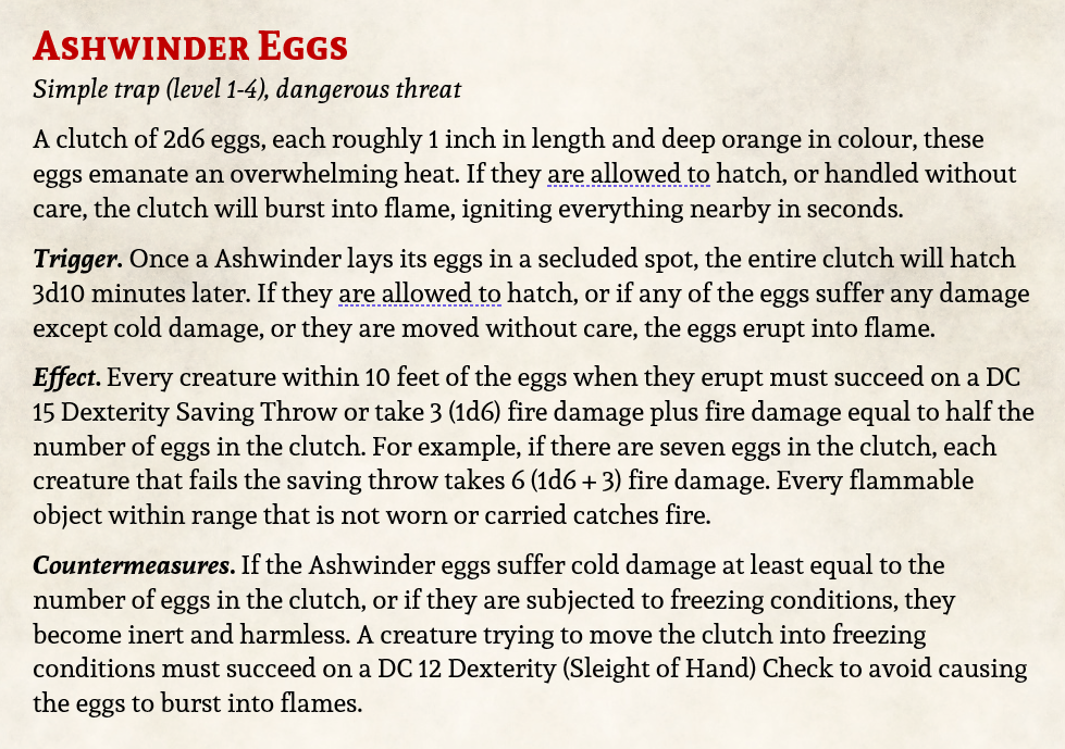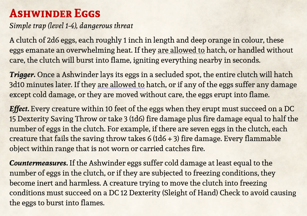 If you happen to be using D&D to create a Harry Potter universe, these eggs make for an interesting problem to solve. In any other world, the characters might need to make checks to work out what these strange eggs are and how to disable them.