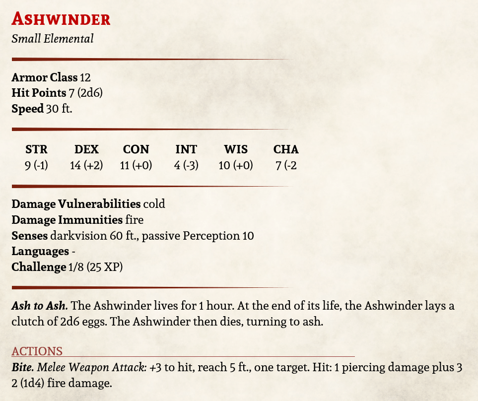 What do you think? Do these stats do the Ashwinder justice. Next week, I’ll be looking at the irritating, death signalling Augurey.