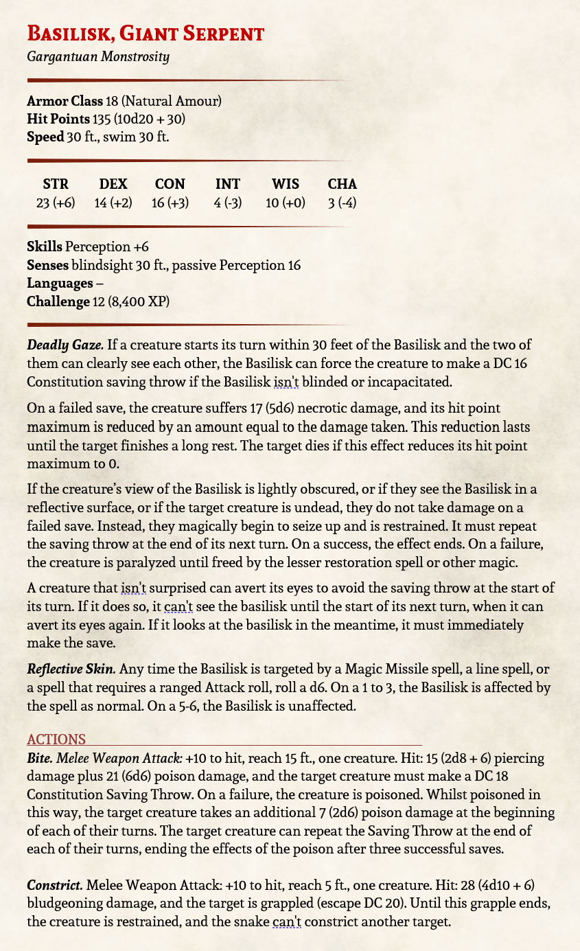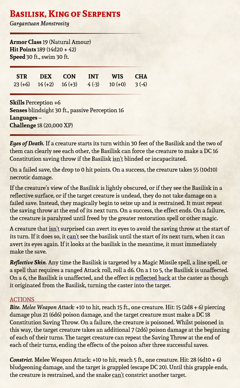 But then, taking away the deadly stare defeats the purpose of building the Basilisk. Also, high level characters can contend with something deadly if they have time to prepare. So, I made two versions of the Basilisk. One, which I named “Great Serpent” is a dangerous monster with poison, reflective skin and stare that can potentially kill. The second, called “King of Serpents”, has a truly life-devastating glare.