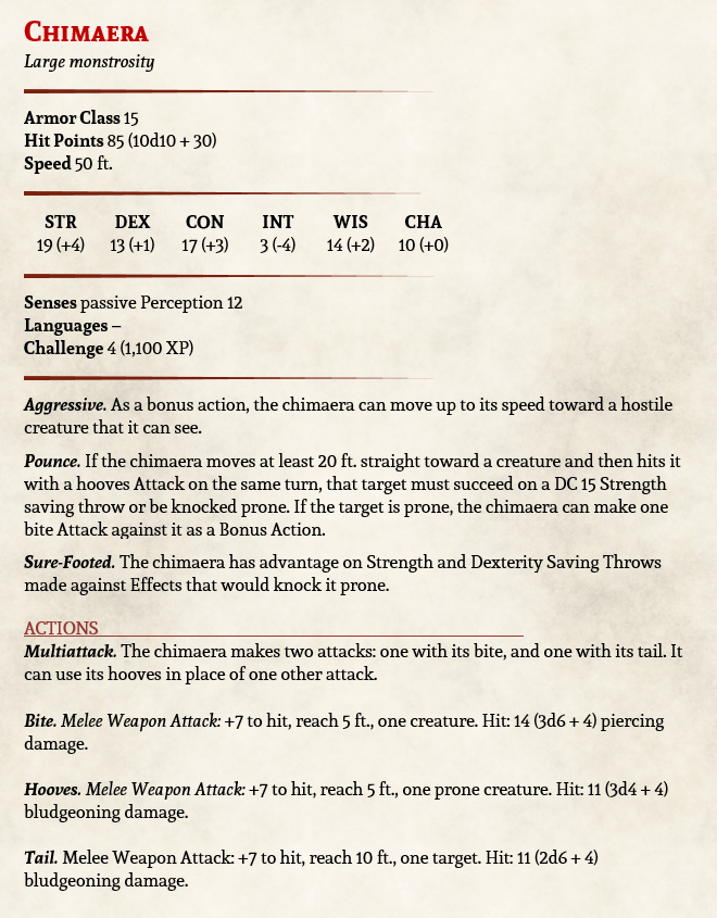 Dungeons & Dragons has a Chimera. It’s the three-headed kind, an angry mess of a monster. The Fantastic Beasts Chimaera is a sleeker model, a hybrid of monsters as you travel down the body rather than across it. Both are incredibly dangerous foes, and both are understandably angry at the world that created them.