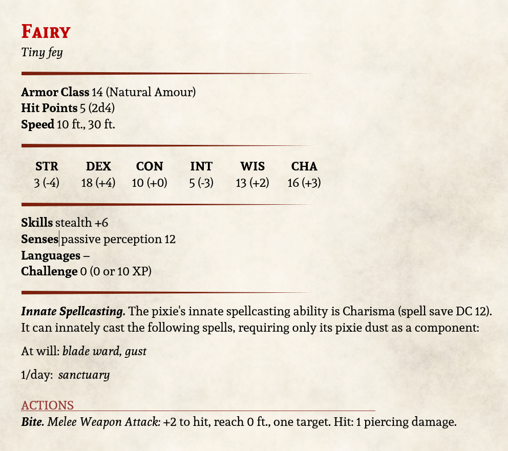 As stat blocks go, its another beast that isn’t going to put up too much of a fight on its own. But once again, that’s not the point of a monster like this. These tiny miscreants will turn up in large groups to pester the adventurers. The sanctuary spell and blade ward cantrip makes the fairy hard to hit if they aren’t attacking, so they can buzz around the adventurers and cause all sorts of irritation and/or grief. Wonderfully irritating and an unique problem for a low-level hero.