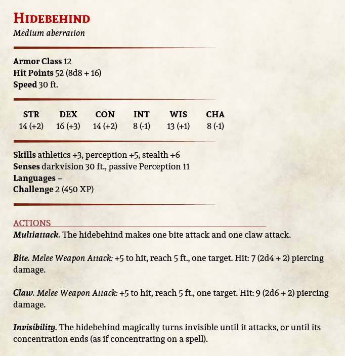 And, because Demiquise and Ghoul both come before Hidebehind in the alphabet, I’ve already made their D&D stat blocks. So this was a case of blending the two and seeing what made the most sense to leave in.