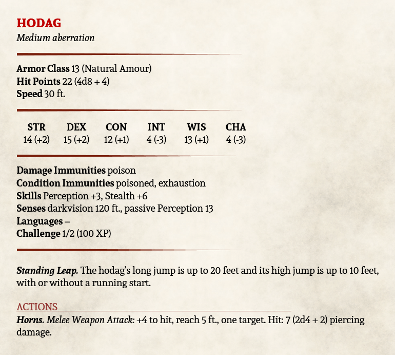 So, whilst it’s not directly stated, I applied immunity to poison and exhaustion conditions. The latter is the more interesting. A monster that doesn’t get exhausted can appear day and night to cause grief. There’s no planning to catch the Hodag whilst it’s sleeping, no rest if they are hunting you.