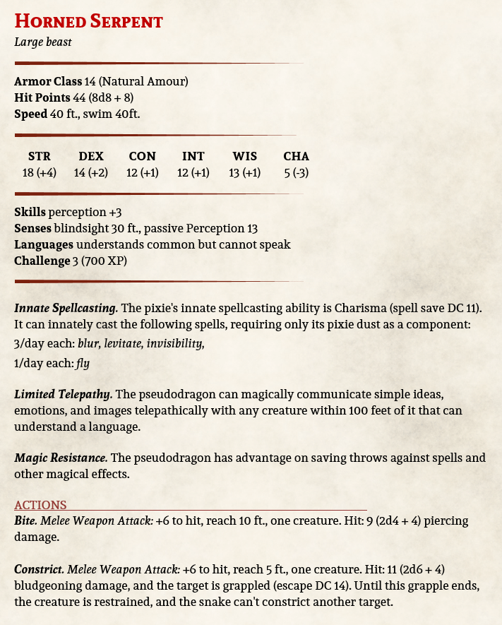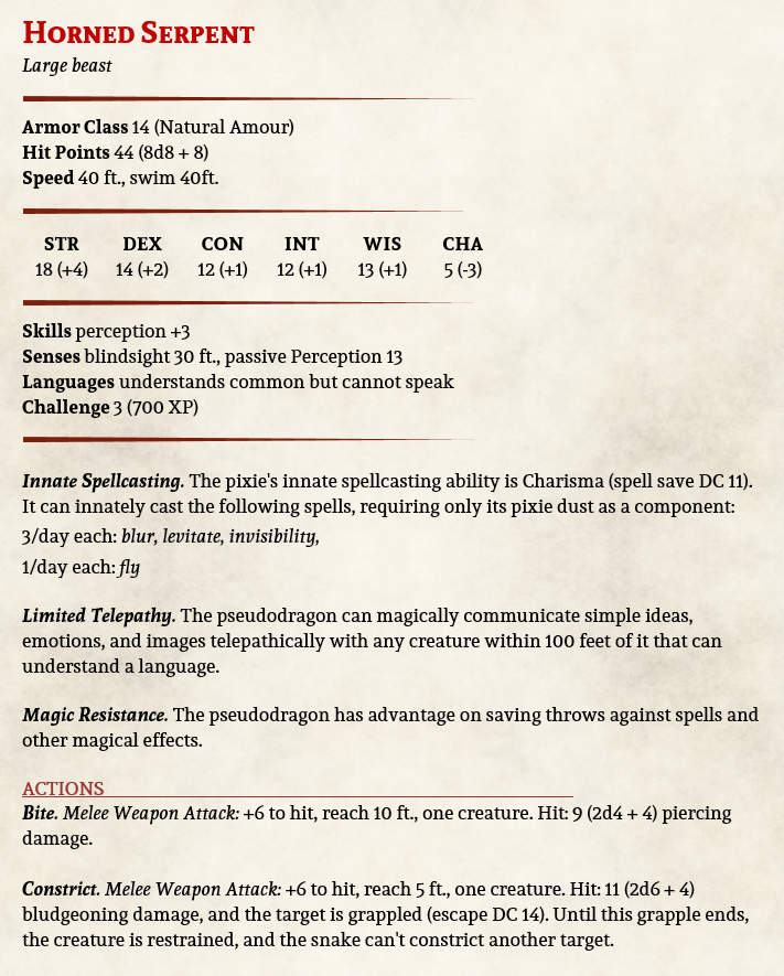 The book doesn’t say whether the Horned Serpent constricts of strikes with venom, so I went with the former. When a giant snake can strike from above, or move unseen, we should make the most of it. In D&D, when you attack, your invisibility drops. Would you rather get awake with a cheeky bite, or use that power to get right up close and cuddly with your prey?