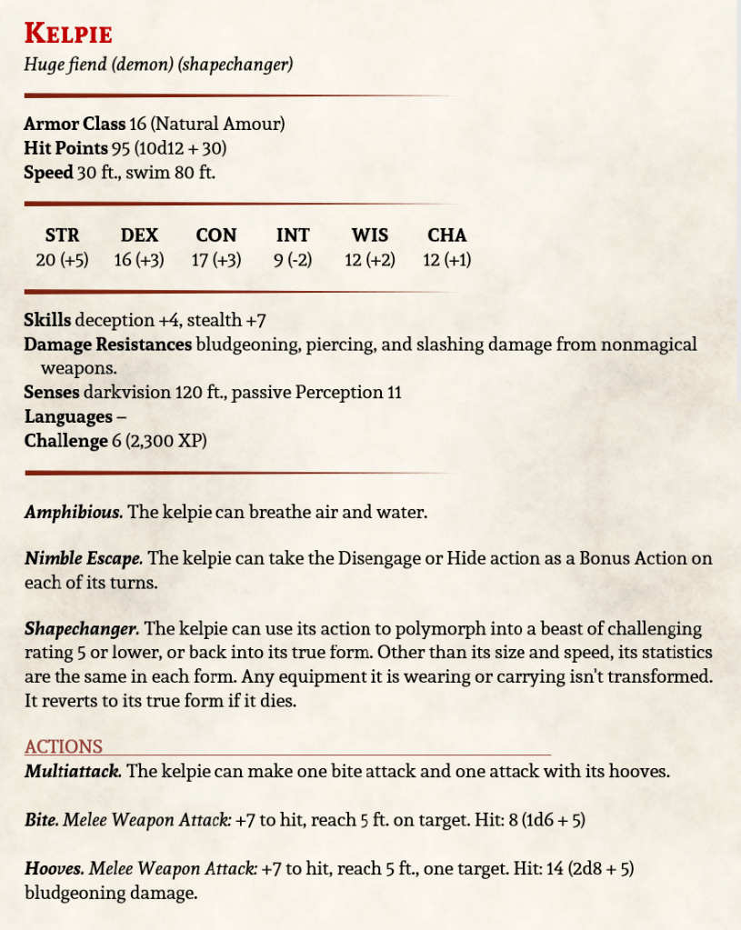 It’s suggested that morphing into a sea serpent is something only the biggest and baddest Kelpie can do, so that became the limit of its shapechange. I decided that the sea serpent has a challenge rating of 5, which puts it on par with a ‘giant shark’, so I think that tracks.