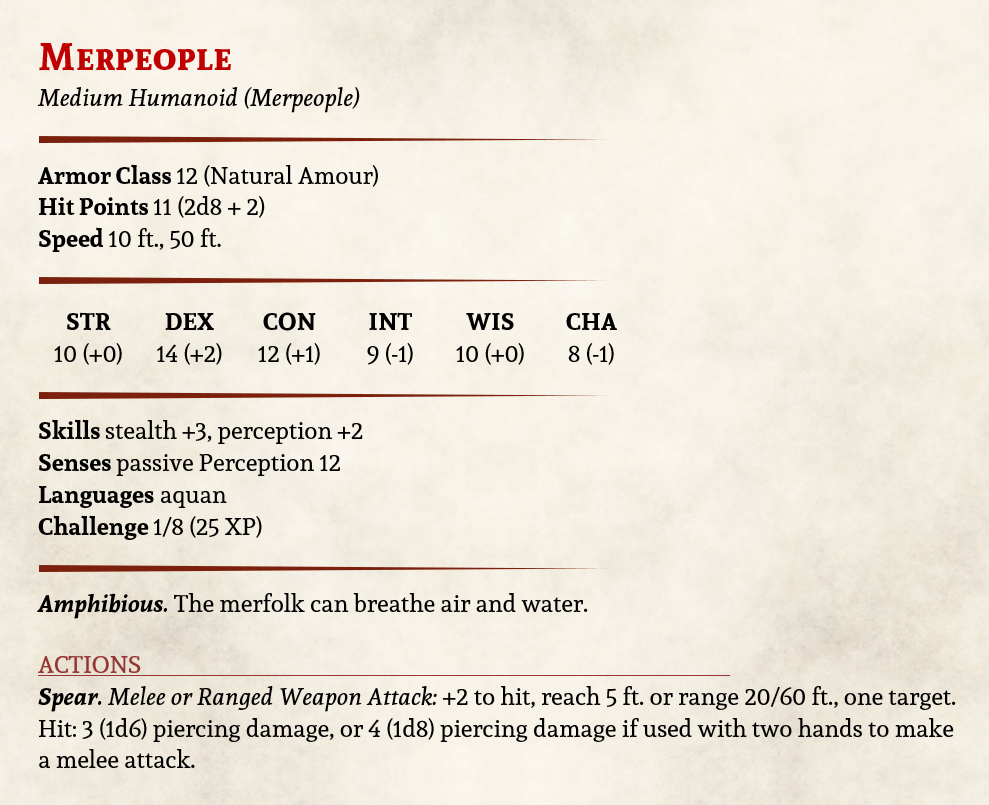 The Fantastic Beasts Mer-kind have been portrayed as a more fish/shark like creature in the past. Less ‘half-human/half-fish’ and more ‘mostly-fish with some human bits’. The brief description also suggests a more tribal, animalistic lifestyle, which I’ve also tried to show in the main statistics and their skill proficiencies.