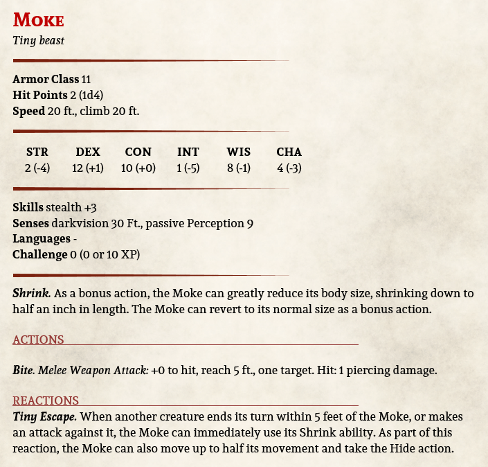 Shrinking doesn’t immediately make you hidden. In D&D, mechanically speaking, you are not hidden until you use your Action to Hide. Hence why I gave the Moke a little reaction that makes sure it has a chance to get away before its ever been spotted, or when a hunter is bearing down on it. Making the shrink ability a bonus action means that it can change size on its turn and then take the Hide action in the same round.
