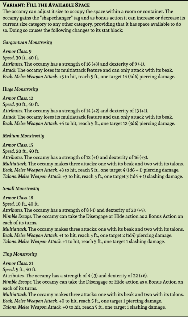I hadn’t considered a size-changing creature before, besides the Enlarge/Reduce spell, and that spell only changes the creature by one size . The occamy had me consider a whole new rule set for how size changing would work, and I’m definitely going to look at how this could be applied to other D&D monsters.