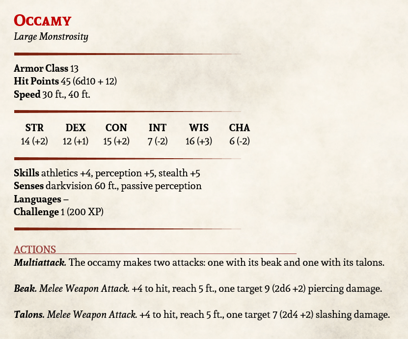 That’s not to say that the occamy isn’t potentially lethal as it grows. The average damage of the bite will floor almost every level 1 character, and a big hit could make a level 3 character regret their life choices. However, the beast is more cumbersome at that size, slower to strike, easier to attack. On the flip side, the tiny occamy will barely leave a mark, but its high AC and ability to nip in and out of combat will leave the characters lacerated and panicking. And the occamy will only be this size in a small space, so the chances are that the whole party won’t be able to strike it.