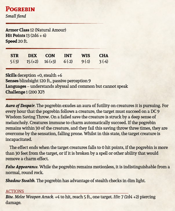 Imagine: the party stumbles out of a tavern after celebrating their most recent, successful adventure. Drunk and exhausted, they fail to notice the stone that shifts from the side of the dirt road and crawls after them, and when one of them begins to feel depressed as they continue the pub crawl, they may simply pass it off as the effects of alcohol. If they don’t suspect anything, it may be the end for that adventurer. Alone in their tavern room, the despair takes over and they collapse. The pogrebin crawls in through the open window, ready to ‘completely devour’ the prey.