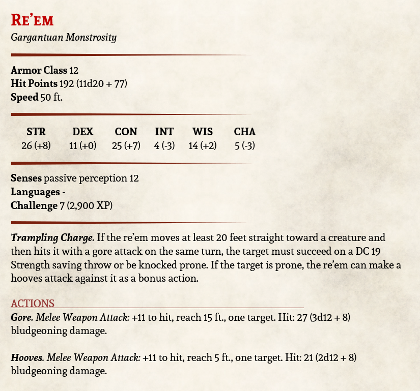 As for allowing players to try and tame a Re’em so they can ride it… I’ll leave you to decide the animal handling roll they would need to make before you allowed that to happen.