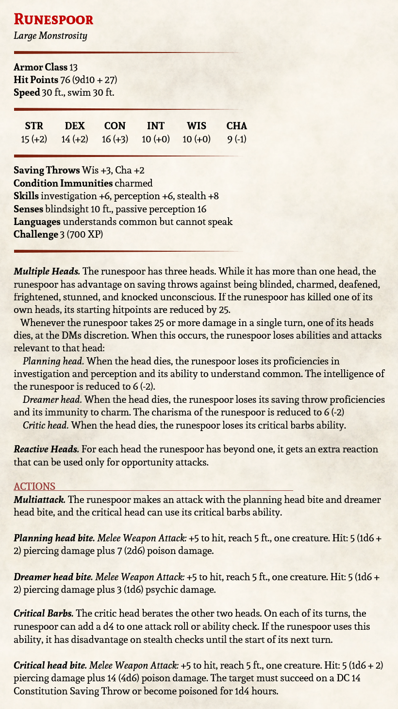 The Runespoor is therefore not an impossible D&D monster, but the fact that the heads are so different requires some extra thought. The Ettin heads are often very different personalities but do not perform different functions that would effect their stats. The hydra heads all have a straightforward chomp. The Tiamat heads have unique breath weapons but, again, that’s where the complications end.