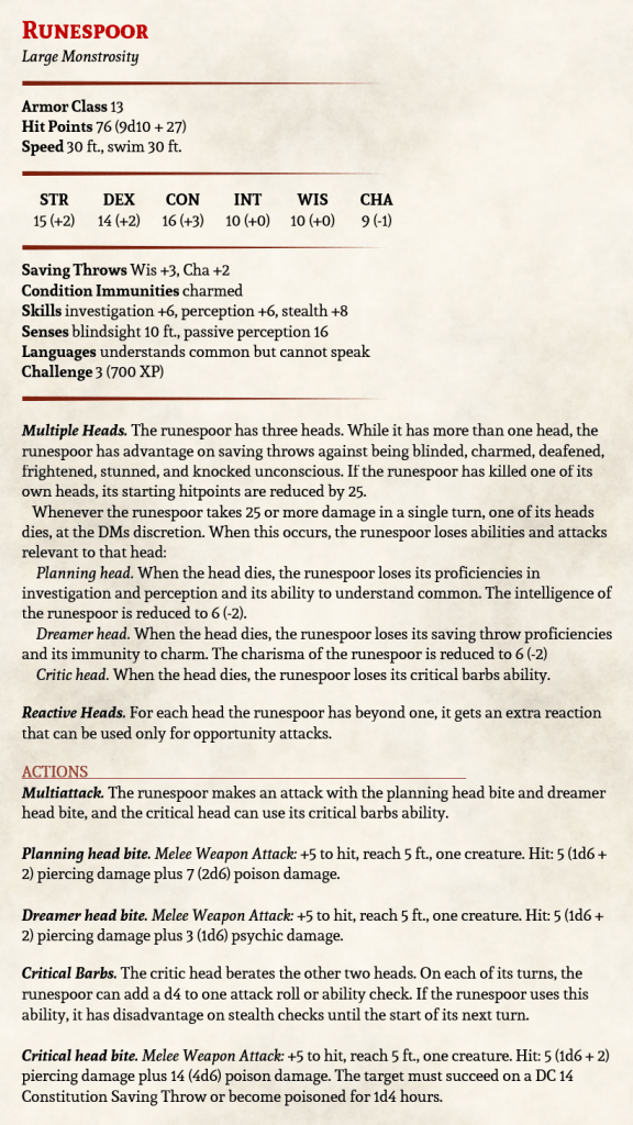 There is probably an easier way to convert the Runespoor for D&D play. There’s definitely a more complicated version. Each head could have its own stat block and abilities, or you could simplify it right down and only have slightly different attacks.