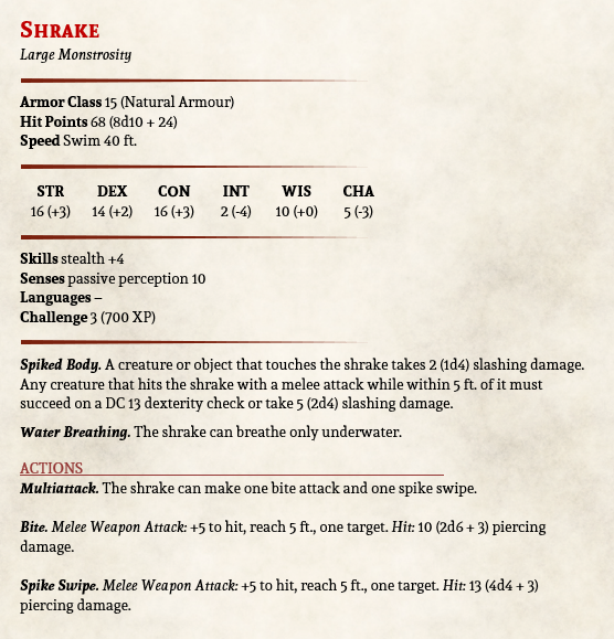 Alternatively, these sea pests can show up whenever ships are sailing their waters, or an adventure leads the heroes underwater. I have to imagine that the wizards created the Shrake with a bad attitude, otherwise they wouldn’t seek out fishing gear to demolish.