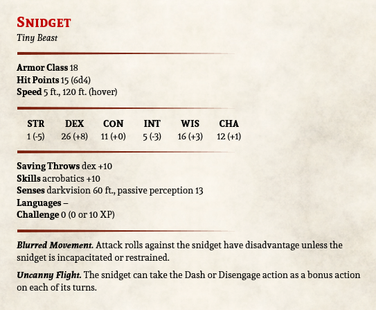 And what’s more, if you’re planning on running a game of Quidditch in your D&D game, you could use these stats for your snitch. Minus the intelligence, wisdom and charisma scores of course.