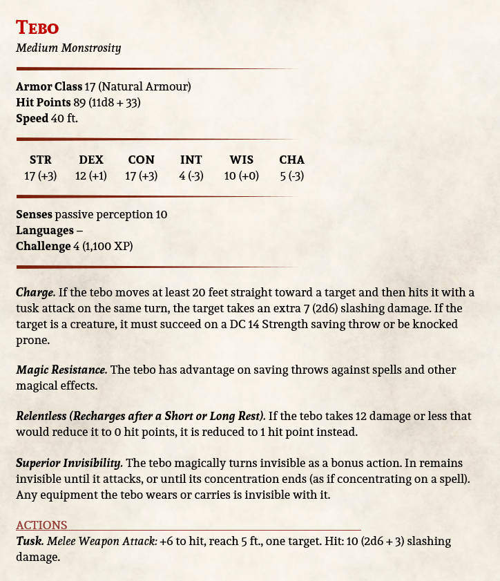 Invisibility usually requires an action in combat, meaning that the Tebo would disappear, and then attack next turn. That doesn’t fully capture the idea that this creature is “virtually impossible to capture or evade”. So I gave this creature an edge. The Tebo can bonus action teleport, and then use it’s action to sprint from battle, or sideswipe it’s foe.