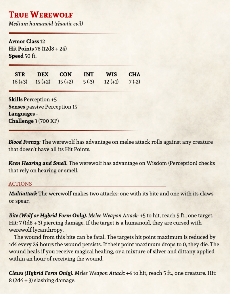 What I mean by True Werewolf, is that the D&D equivalent is technically not a werewolf. A Lycan can choose to change whenever it feels like it, but a Werewolf only transforms under a full moon. This is why the stat block above is not a shapechanger like the previous iteration. Once the cursed person changes, they are essentially an entirely new monster.