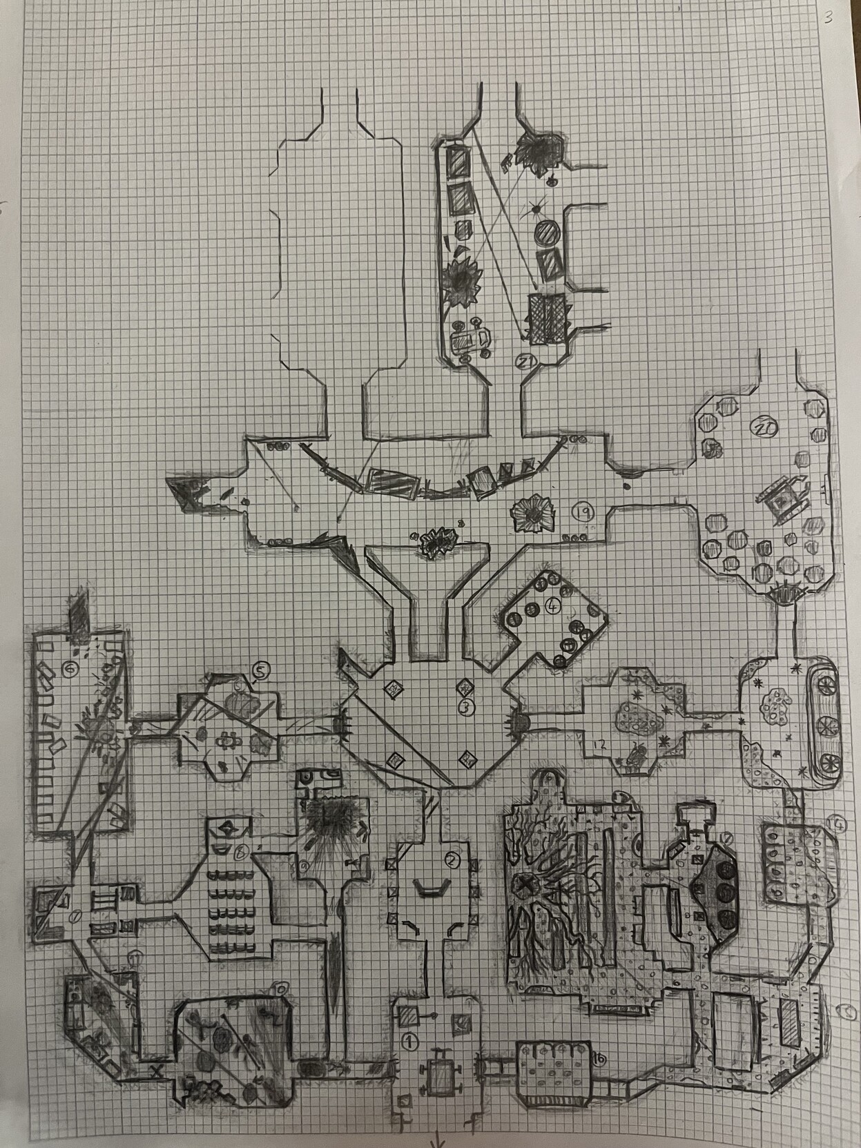 So this has evolved into a dungeon layer of two halves. The half complete is a monster-filled danger zone that the group does not need to explore but will have an easier time later if they do. The half I’m making now will either be filled with clan members that will eventually be supportive allies, or rooms of enemies viciously defending the technology they covet.