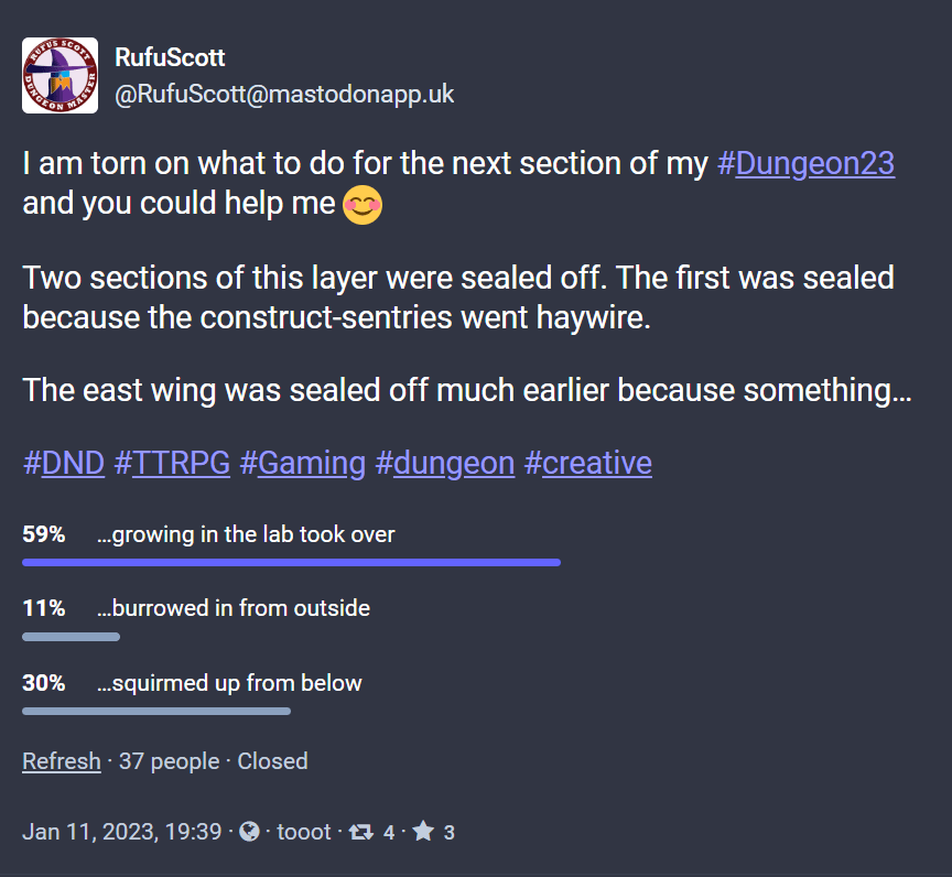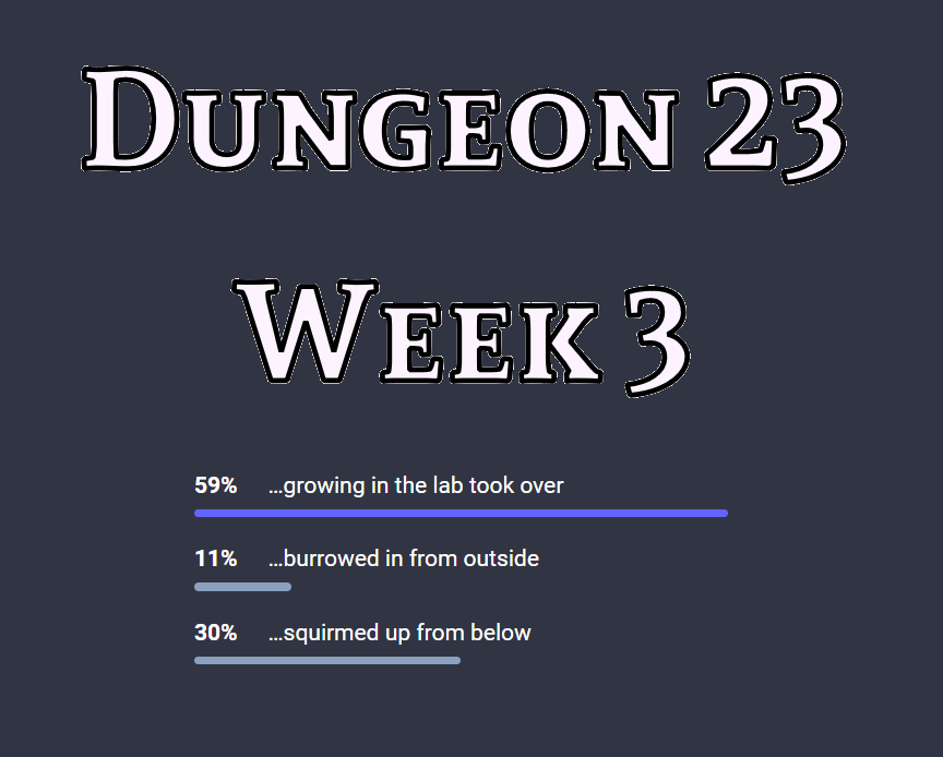 So this week starts out with a lab containing a monster grown from a failed experiment, with ‘mask’ as the key word. The week ended with me moving on to the rooms where the party can first interact with the clan that lives in the rooms not currently infested with monstrous plants.