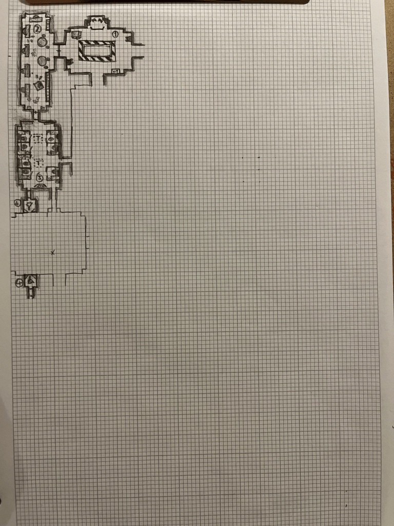 What I’ve found curious about this self-imposed project is how the ideas flow steadily. I came up with an overall idea for the whole megadungeon from the start, but I didn’t really know how I wanted the whole of Layer 1 to look until it was half-formed. As I started on Layer 2, I had even less of an idea of how it should look. Nevertheless, day by day, the mental image is developing. I don’t think I would have created the same dungeon if I’d sat down to build it in one go.