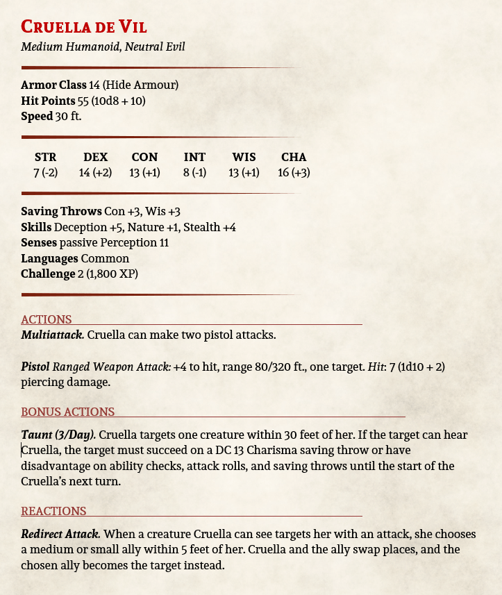Cruella as a 5th Edition Dungeons and Dragons character. I had to decide on a weapon, otherwise she’s not much of a threat, and a modern pistol seems like something she’d have in her purse. I also had to make sure her biting insults and selfishness made it into her stats, hence the bonus action and reaction.