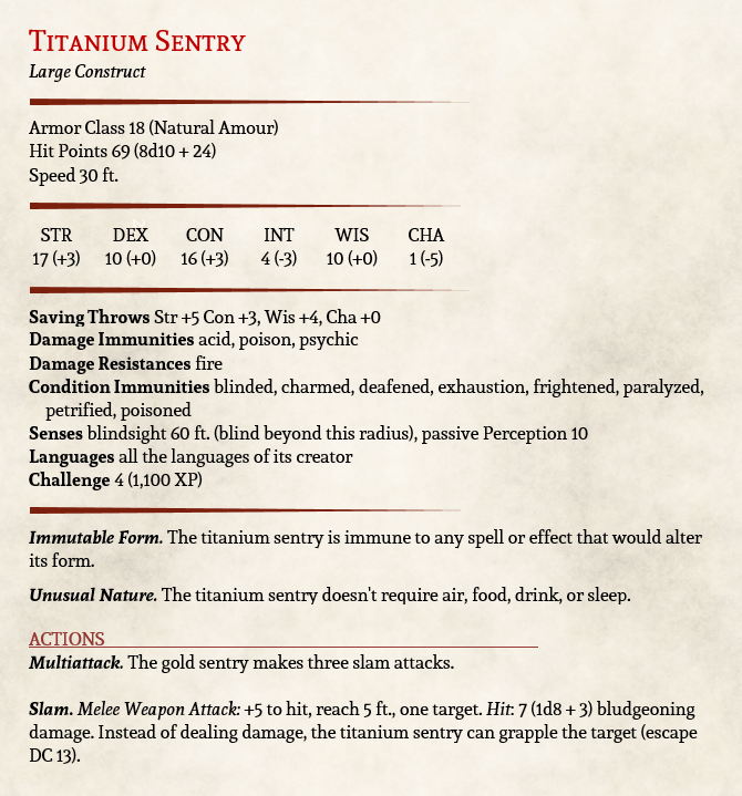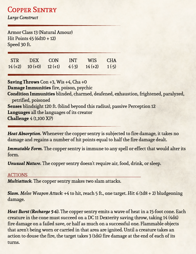 Possibly the first Sentry the part will meet, this sentry is built to withstand high temperatures and use its internal heat to spew damage on interlopers. A metal construct like this should have a high AC, but a lot of this layer has been recycled; imagine a lot of exposed wires and smoke spilling out of this robot.