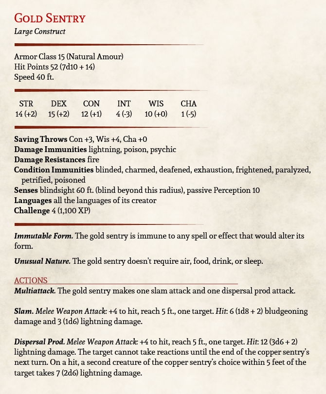 The Gold Sentry was purely for defence. Whereas the other sentries had a way they could assist in the manufacture process, this robot was built to keep people out. One arm is essentially a large cattle prod designed to keep enemies stunned.