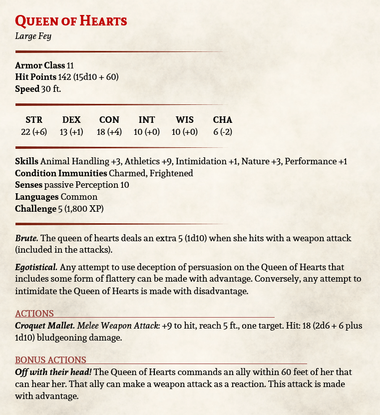 The Queen gets a point for having henchmen. That’s all she gets. A disorganised, bumbling rabbit and a pack of living player cards that fold at the first suggestion of danger is not going to add any amount of punch to your TTRPG.