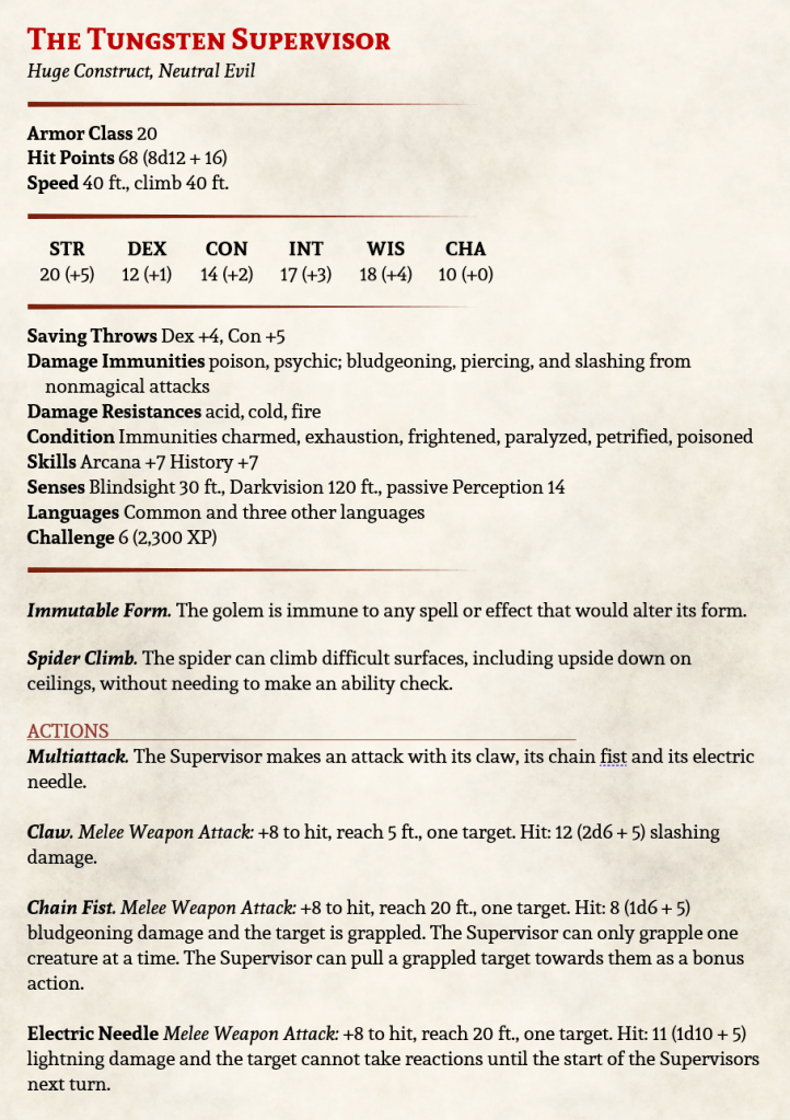 So far in this dungeon, negotiating with the clans within can prove fruitful. Whilst the rest of the Tungsten Line are semi-rational creatures, ‘The Tungsten Supervisor’ is not going to let any unauthorised personnel wander ‘his domain’. When the party have to contend with this strange creature, the rest of the clan will be more than happy to look the other way; they aren’t fans of their Supervisor either…