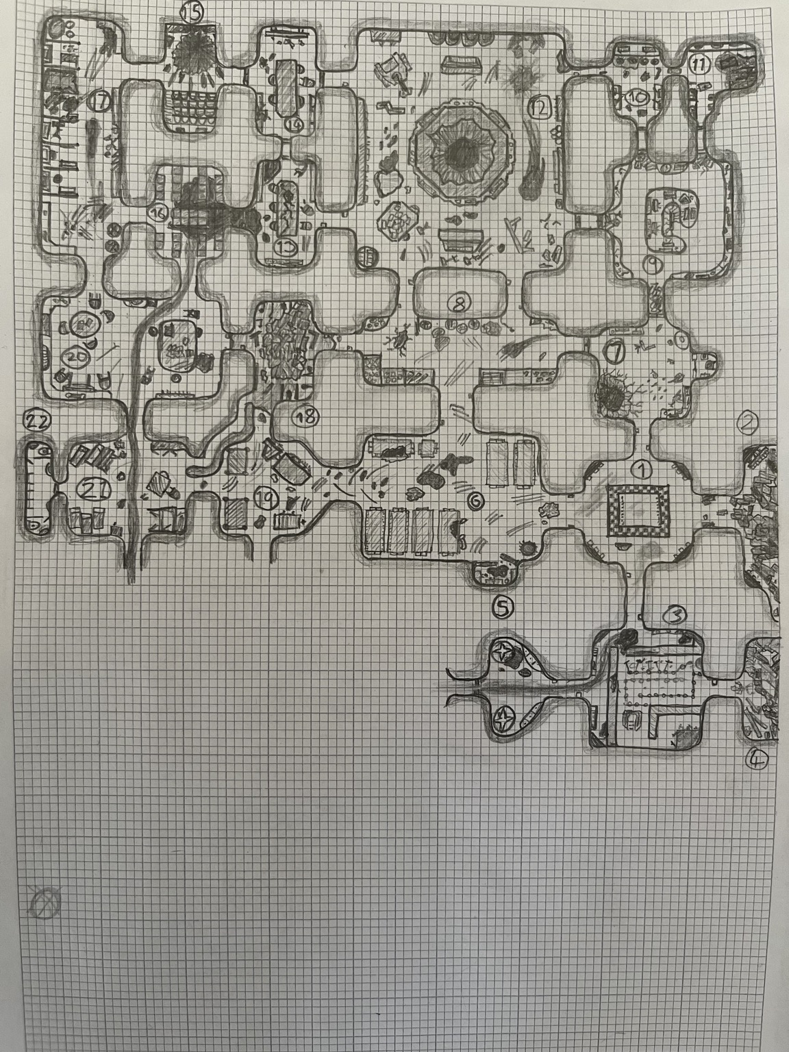 ‘Host Zero’ is therefore a Grimworm Adult with some extra strength and awareness. Host creatures wander the halls or lie inert on the floor. Infant Grimworm lurk in shadows, waiting for something with a pulse to reawaken. The few Grimworm Adolescents that Host Zero hasn’t killed lurk in the bunkers to the south, surrounding by the decimated remains of the refugees that were devoured decades earlier.