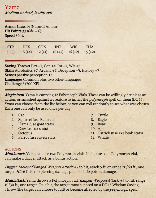 A lot of Disney movies end with a chase sequence, and whilst that can be fun, Table Top Games are most satisfying with a final encounter. This particular chase involves multiple polymorphs and a wild palace structure to navigate through. Nevertheless, a few good Athletics Checks and Wisdom Saving Throws and this finale is over. If it comes to a face to face brawl with Yzma, she has to hope that there’s a few guardsmen left to aid her.