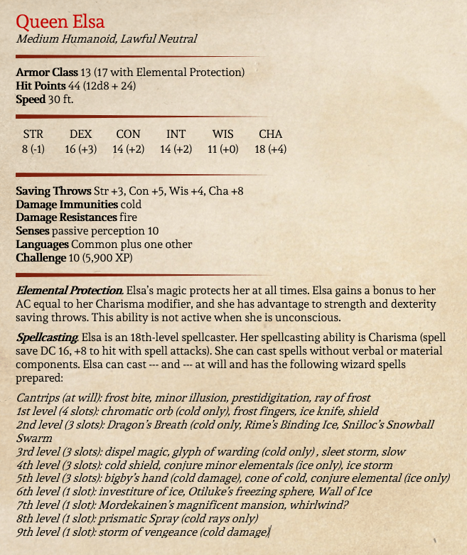Need to have a think about this one. As we the nanomachines from Big Hero 6, Elsa’s powers are so amorphous that it is difficult to pin down as written stats and abilities. A lot of what she can do feels more like big narrative moments to be describe rather than acted out.
