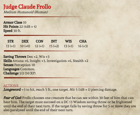 I love Frollo as a villain. Great character, grim motivations, great songs. Nevertheless, he’s not big enough or powerful enough to play the lead antagonist in a D&D campaign. Once his head henchmen turns, he’s very vulnerable. Paris and Notre Dame depicted in the movie are definitely good inspiration for your game’s setting, but Frollo himself is just a bit too frail.