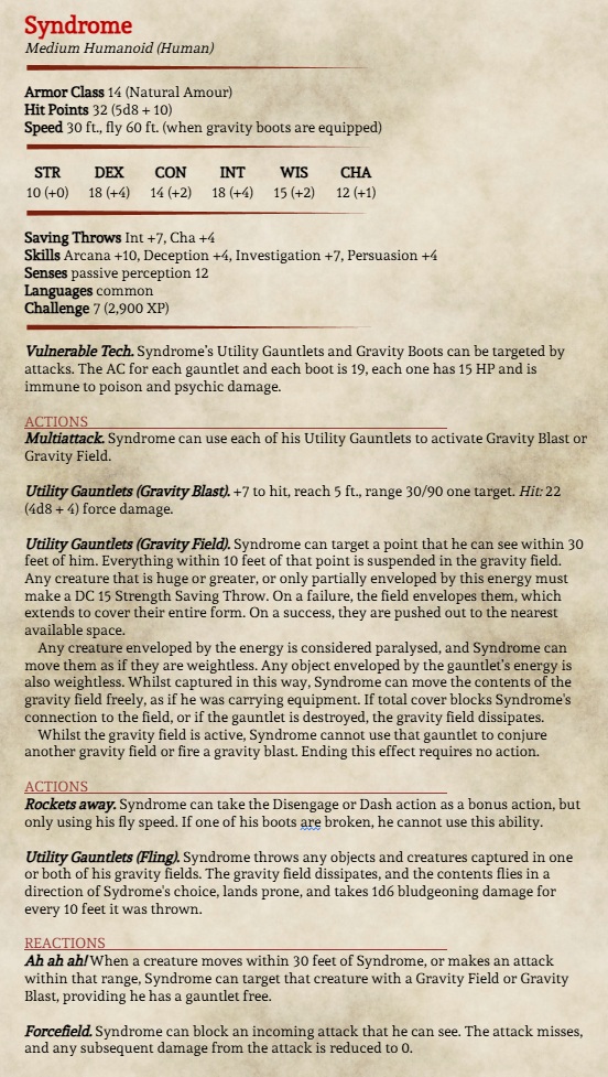 It’s the gloves that make Syndrome a real problem. ‘Restraint’, ‘stun’ and especially ‘paralysis’ in D&D are conditions that can lead to serious grief for the player characters. You are less able, or completely unable, to take actions yourself and any attacks coming your way are going to be assisted or magnified. The fact that there doesn’t seem to be a way to ‘save’ from their effects makes them all the more threatening.
