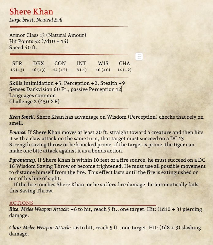 If you playing as animals or man-cubs in this world, or as regular humans, of course Shere Khan is a threat. He’s a sentient tiger. Give your characters any other weapons, or if they find out about his pyrophobia early on, this drops to a 1.